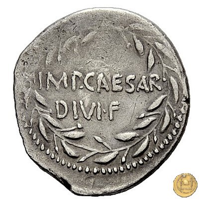 546/4 - denario C. Iulius Caesar Octavianus Dritto: AVGVR - PONTIF Testa di Giove Ammon a destra. Verso: IMP - CAESAR / DIVI - F La Vittoria su globo a destra; tiene la corona vittata con la mano destra e regge un ramo di palma sulla spalla con la mano sinistra. | |