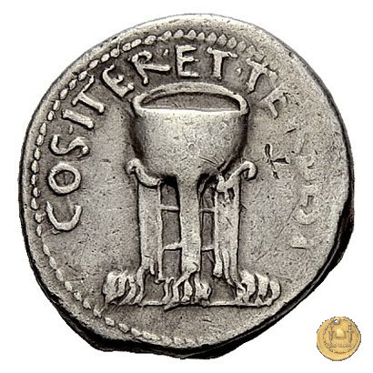 538/2 - denario C. Iulius Caesar Octavianus Dritto: IMP. CAESAR. DIVI. F. III. VIR. ITER Tripode con calderone. Sul calderone è inscritto: R. P. C Verso: COS. ITER. ET / TERT. DESIG Una corona d'alloro. | |