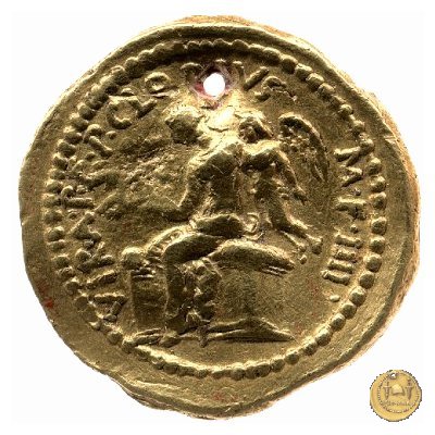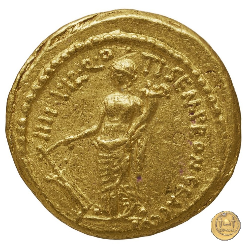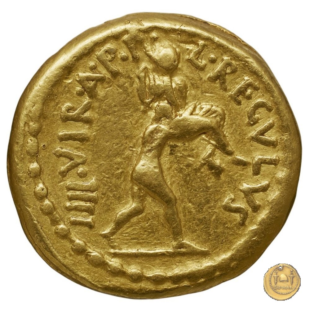 494/3 - aureo C. Iulius Caesar Octavianus / L. Livineius Regulus Dritto: C. CAESAR - III. VIR. R. P. C Testa di Ottaviano a destra. Verso: L. REGVLVS - IIII. VIR. A. P. F Enea in cammino verso destra; trasporta il padre Anchise sulla spalla sinistra. | |