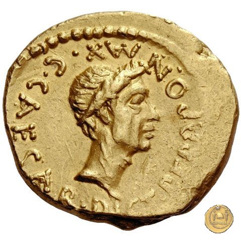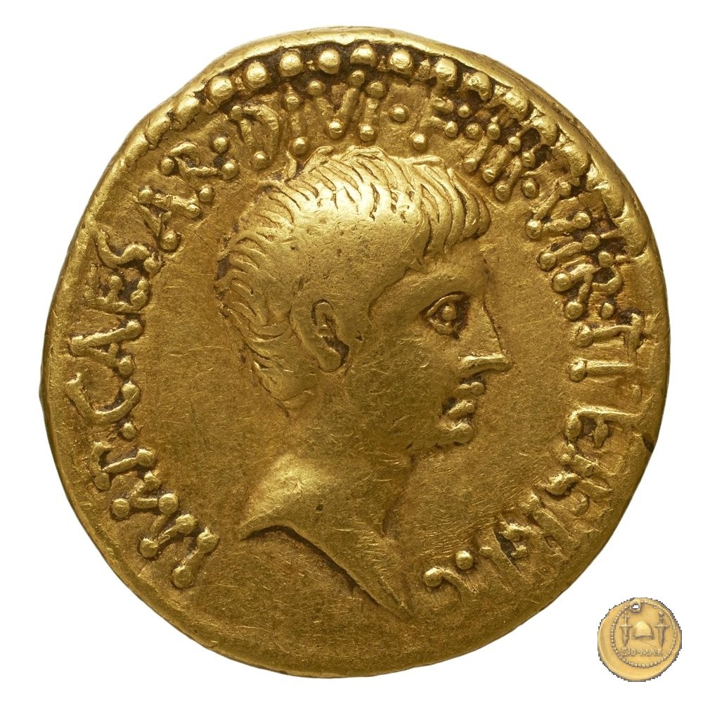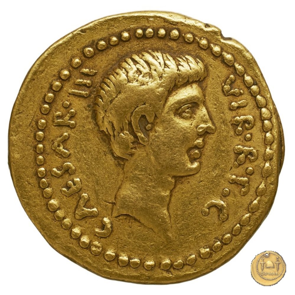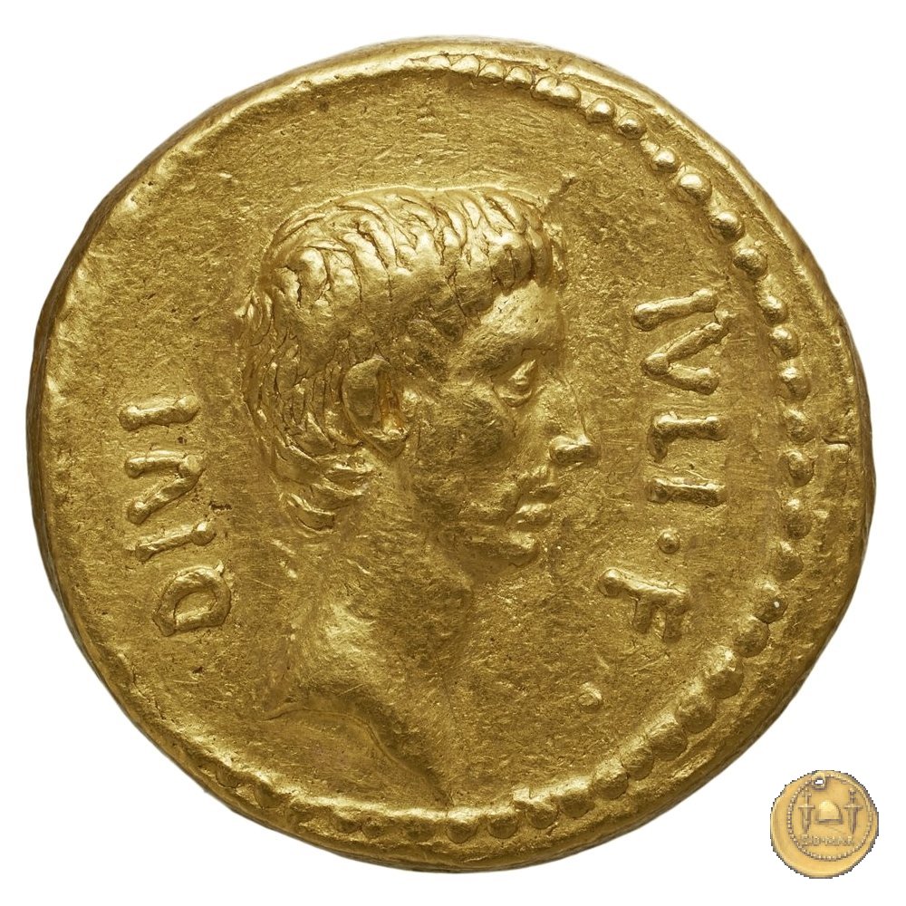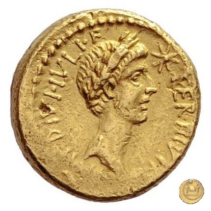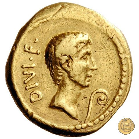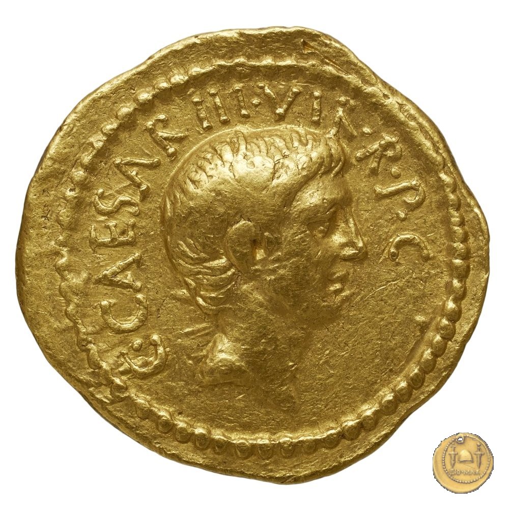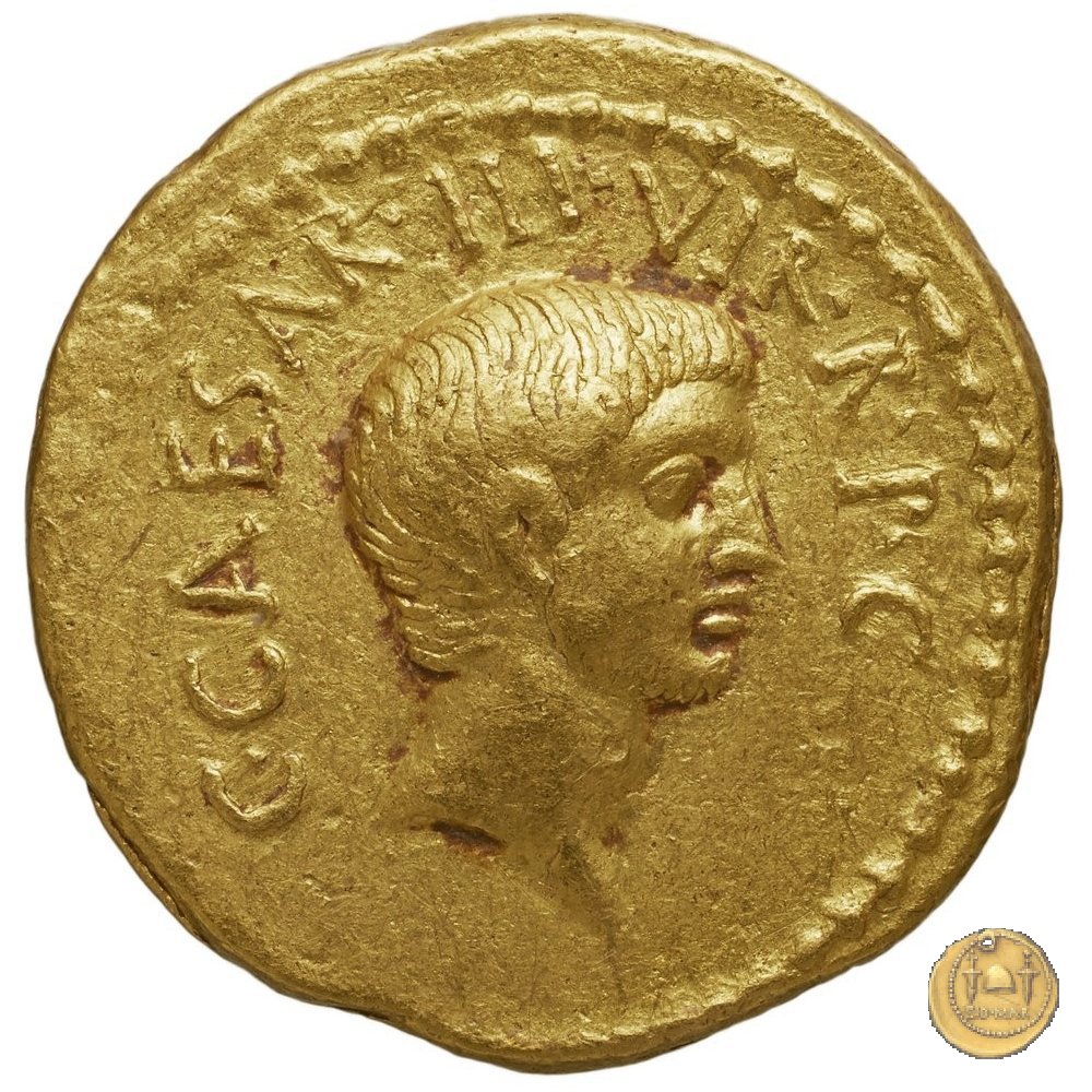 540/1 - aureo C. Iulius Caesar Octavianus Dritto: IMP. CAESAR. DIVI. F. III. VIR. ITER. R. P. C Testa di Ottaviano a destra. Verso: COS. ITER. ET. TER. DESIG Tempio tetrastilo con colonne ioniche su alto podio; all'interno una figura velata con il lituus; sull'architrave la scritta: DIVO. IVL ; sul frontone una stella. A sinistra un'altare acceso. | |