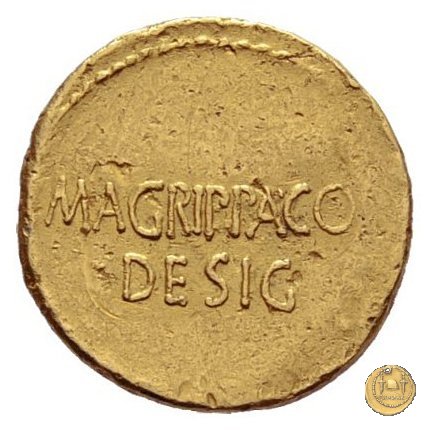 534/1 - aureo C. Iulius Caesar Octavianus / M. Vipsanius Agrippa Dritto: IMP. DIVI. IVLI. F. TER. III. VIR. R. P. C Testa laureata di Giulio Cesare a destra. Davanti una stella. Verso: M. AGRIPPA COS / DESIG • | |