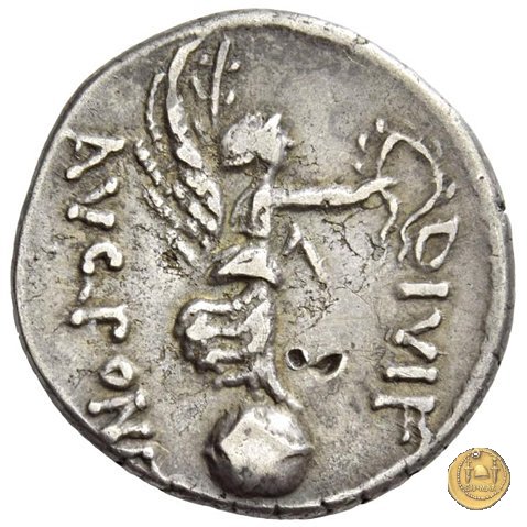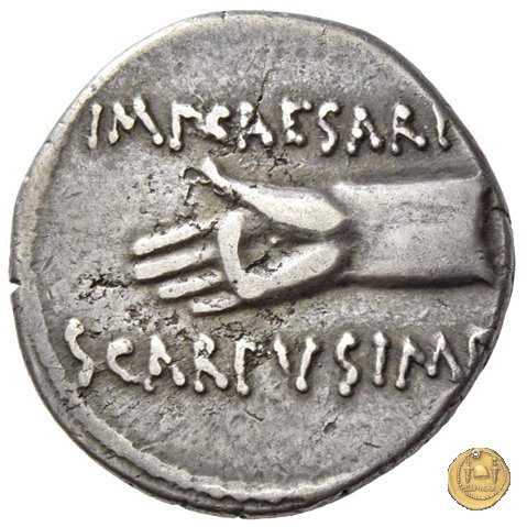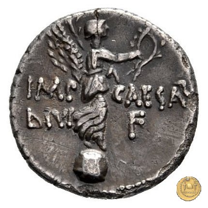 546/6 - denario C. Iulius Caesar Octavianus / L. Pinarius Scarpus Dritto: IMP. CAESARI - SCARPVS. IMP (oppure IMP ) Mano destra a palmo aperto. Verso: DIVI. F - AVG. PONT La Vittoria su globo a destra; tiene la corona vittata con la mano destra e regge un ramo di palma sulla spalla con la mano sinistra. | |