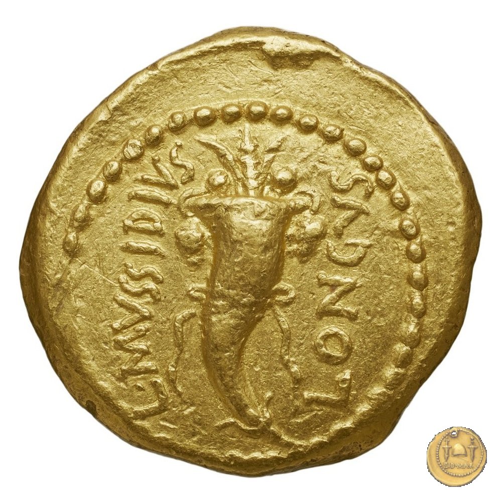 494/15 - aureo C. Iulius Caesar Octavianus / L. Mussidius Longus Dritto: C. CAESAR. III. VIR. R. P. C Testa di Ottaviano a destra. Verso: L. MVSSIDIVS - LONGVS Cornucopia ornata con nastri. | |