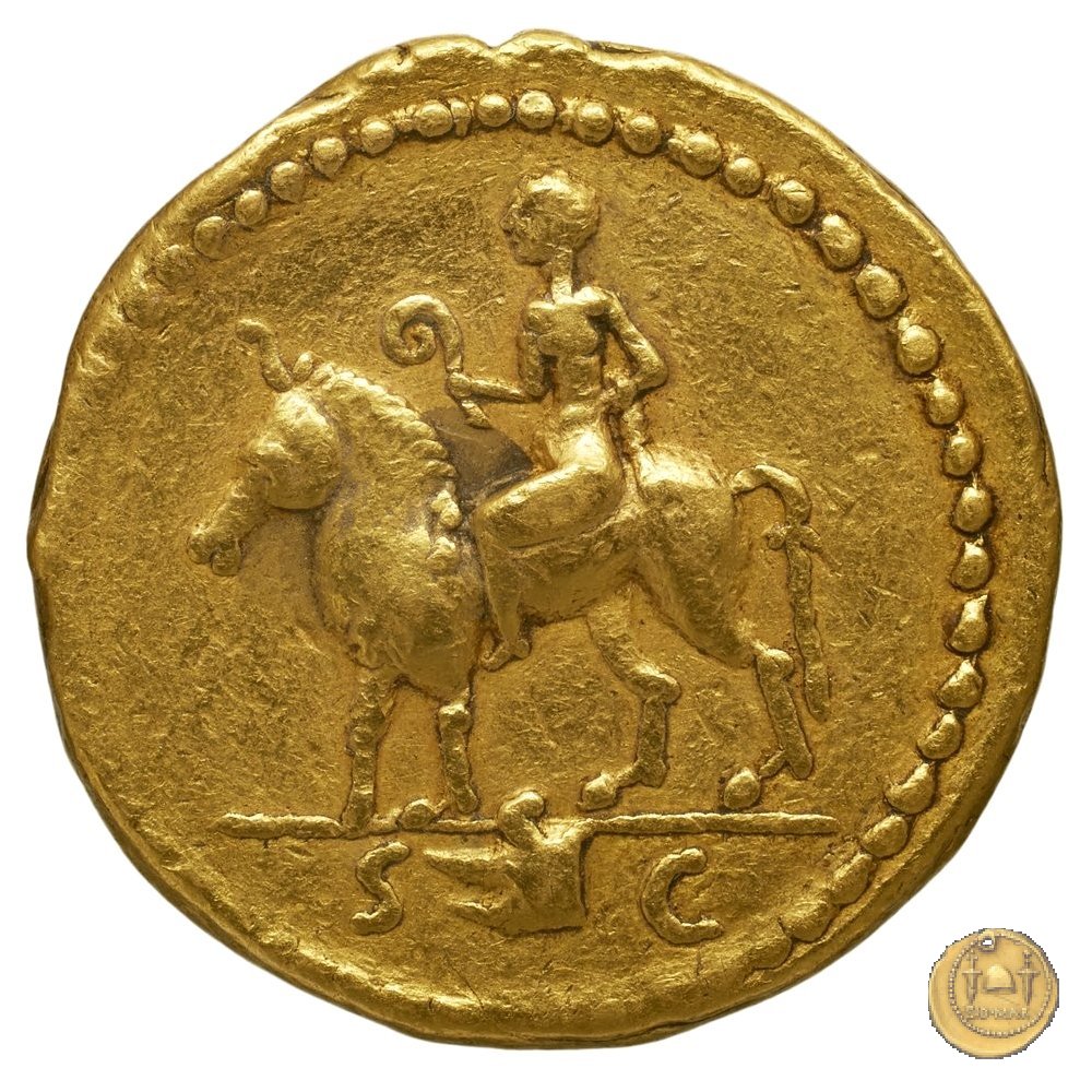 494/6 - aureo C. Iulius Caesar Octavianus / P. Clodius M.f. Dritto: C. CAESAR. III. VIR. R. P. C Testa di Ottaviano a destra. Verso: P. CLODIVS. M. F. IIII. VIR. A. P. F Venere seduta a sinistra su cippus; tiene con la mano destra un uccellino (una colomba) ed abbraccia con la sinistra Cupido che vola sulle spalle. | |