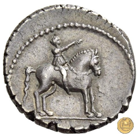 490/1 - denario C. Iulius Caesar Octavianus Dritto: C. CAESAR. IMP Testa di Ottaviano a destra. Verso: S. C Statua equestre a sinistra: il cavaliere ha la mano destra sollevata e tiene le redini con la sinistra. | |
