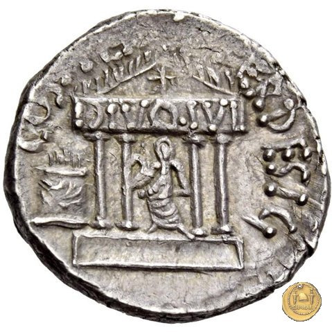 540/2 - denario C. Iulius Caesar Octavianus Dritto: IMP. CAESAR. DIVI. F. III. VIR. ITER. R. P. C Testa di Ottaviano a destra. Verso: COS. ITER. ET. TER. DESIG Tempio tetrastilo con colonne ioniche su alto podio; all'interno una figura velata con il lituus; sull'architrave la scritta: DIVO. IVL ; sul frontone una stella. A sinistra un'altare acceso. | |