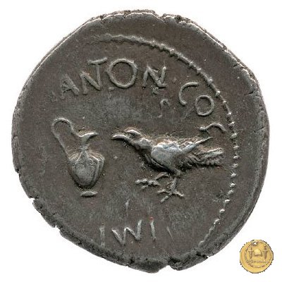 489/2 - denario M. Antonius / M. Aemilius Lepidus Obverse: M. ANT ON. IMP Lituus, brocca e corvo. Reverse: M. LEPID. IMP Simpulum, aspergillum, ascia (securis) e apex. | |