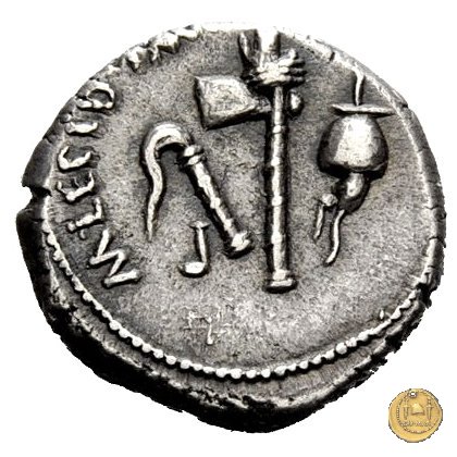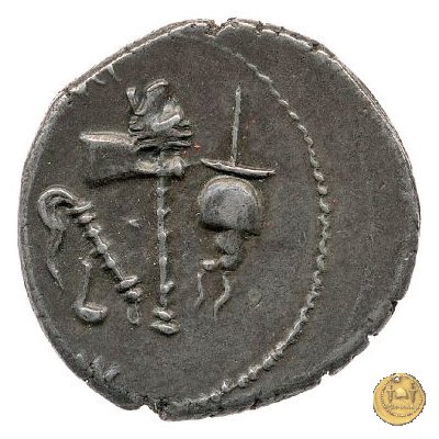 489/1 - denario M. Antonius / M. Aemilius Lepidus Obverse: M. ANT ON. COS - IMP Lituus, brocca e corvo. Reverse: M. LEPID. COS. IMP Simpulum, aspergillum, ascia (securis) e apex. | |