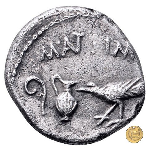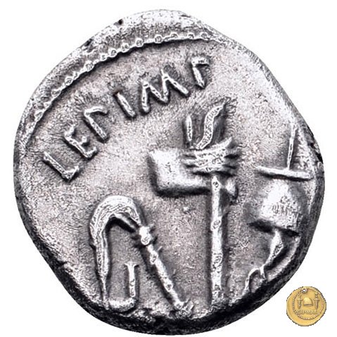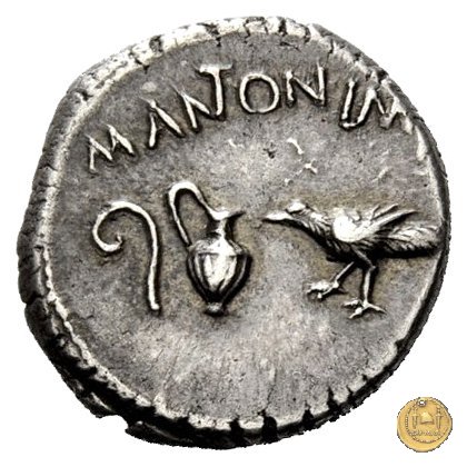 489/3 - quinario M. Antonius / M. Aemilius Lepidus Obverse: M. ANT . IMP Lituus, brocca e corvo. Reverse: LEP. IMP Simpulum, aspergillum, ascia (securis) e apex. | |