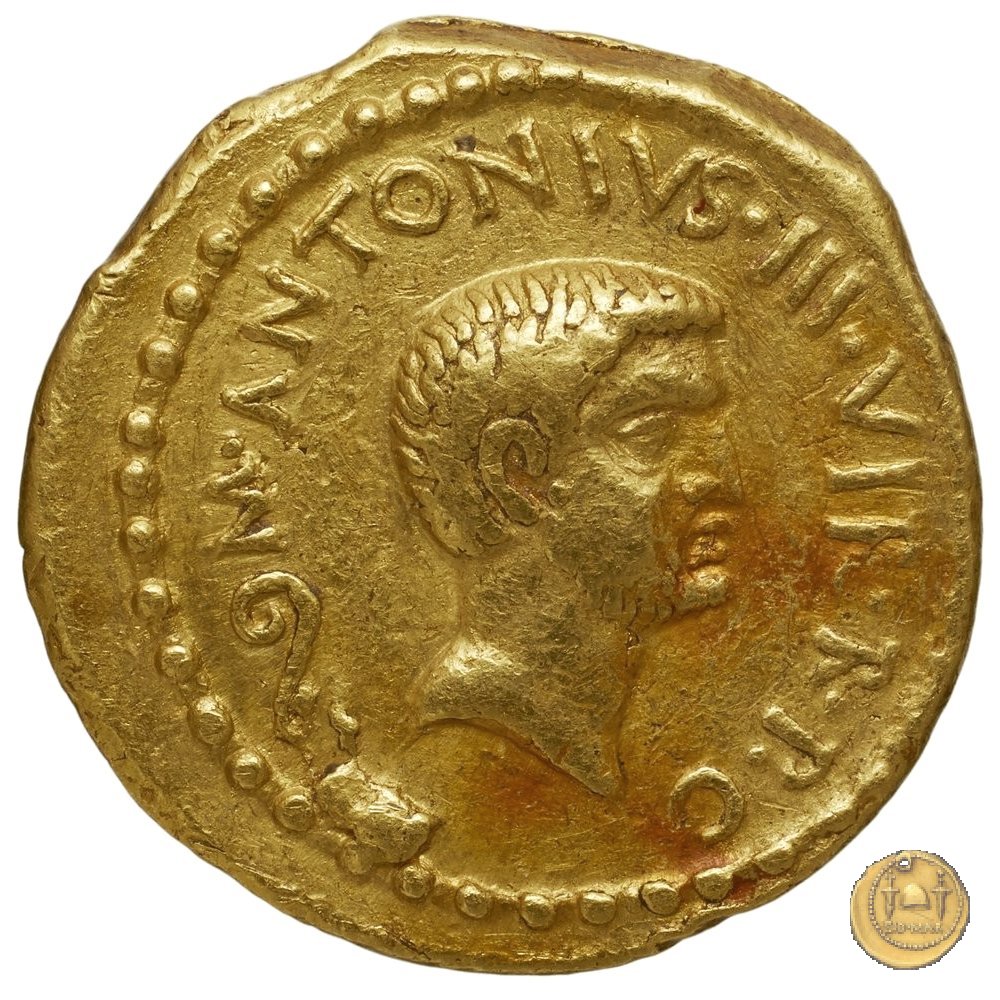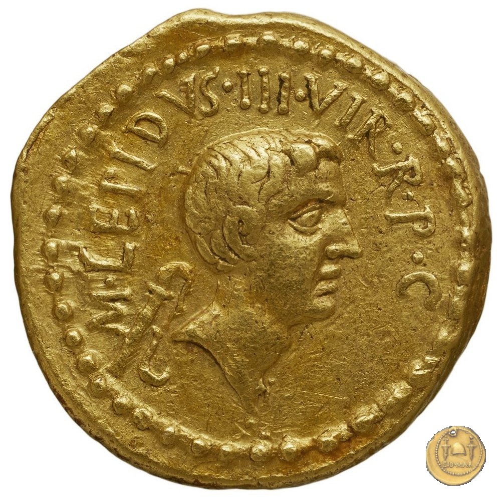 492/2 - aureo M. Antonius / M. Aemilius Lepidus Obverse: M. ANTONIVS. III. VIR. R. P. C Testa di Marc'Antonio a destra. Dietro un lituus. Reverse: M. LEPIDVS. III. VIR. R. P. C Testa di Lepido a destra. Dietro un aspergillum e un simpulum. |