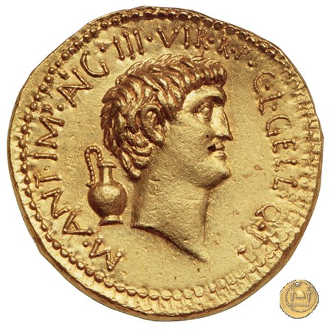 517/7 - aureo M. Antonius / C. Iulius Caesar Octavianus / L. Gellius Obverse: M. ANT. IMP . AV G. III. VIR. R. P. C. L. GELL. Q. P Testa di Marc'Antonio a destra. Dietro una brocca. Reverse: CAESAR. IMP. PONT. III. VIR. R. P. C Testa di Ottaviano a destra. Dietro il lituus. | |
