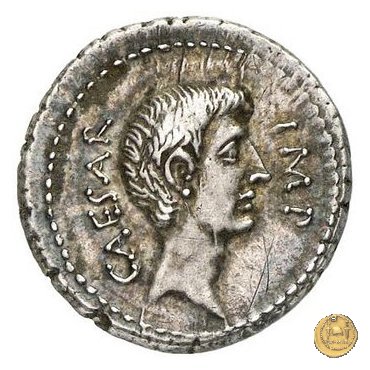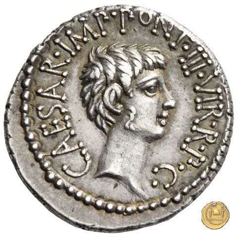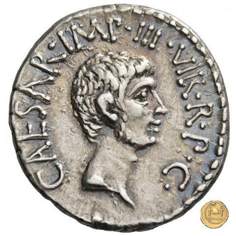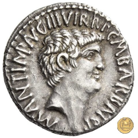 517/6 - denario M.Antonius/C.Iulius Caesar Octavianus/M.Cocceius Nerva Obverse: M. ANT. IMP . AV G. III. VIR. R. P. C. M. NE RVA. PRO Q. P Testa di Marc'Antonio a destra. Reverse: CAESAR. IMP. PONT. III. VIR. R. P. C Testa di Ottaviano a destra. Dietro il lituus. | |