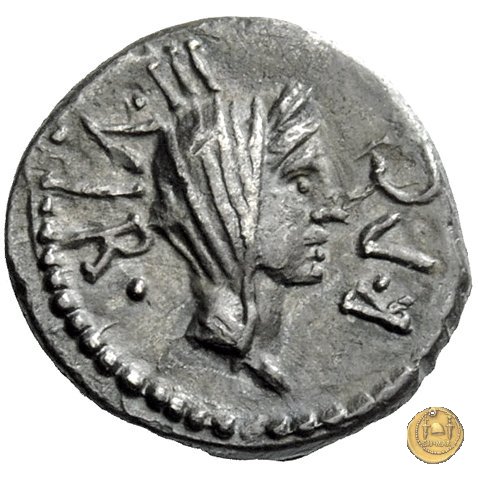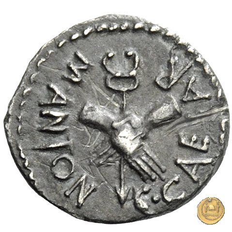 517/8 - denario M. Antonius / C. Iulius Caesar Octavianus / L. Gellius Obverse: M. ANT. IMP . AV G. III. VIR. R. P. C. L. GELL. Q. P Testa di Marc'Antonio a destra. Dietro una brocca. Reverse: CAESAR. IMP. PONT. III. VIR. R. P. C Testa di Ottaviano a destra. Dietro il lituus. | |