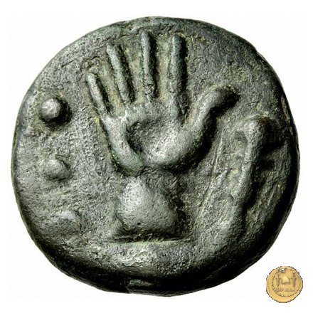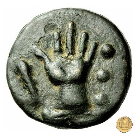Obverse: Mano destra a palmo aperto. A destra una clava; a sinistra tre globetti.