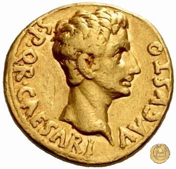 CLM93 Obverse: ![]() CAESAR AVGVSTVS ![]() DIVI F PATER PATRIAETesta di Augusto, laureata, rivolta verso destra. Reverse: ↺ AVGVSTI F COS DESIG PRINC IVVENT; C L CAESARES (esergo) Caio Cesare e Lucio Cesare, in piedi e togati, tengono ognuno una mano su di uno scudo davanti a loro; dietro ogni scudo c'è una lancia; sopra di loro, a sinistra, un lituus rivolto verso destra e a destra un simpulum rivolto verso sinistra. | |