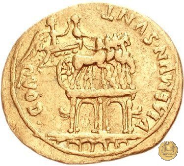 CLM42 Obverse: ![]() CAESARI ![]() AVGVSTOTesta di Augusto, laureata, rivolta verso destra. Reverse: → S P Q R (esergo) Una quadriga rivolta verso destra con il carro decorato e una miniatura di quattro cavalli al galoppo. Il secondo e il quarto cavallo della quadriga ha la testa rivolta verso sinistra. | |