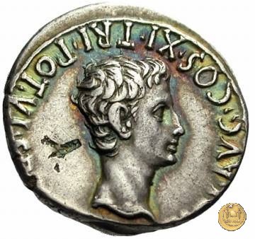 CLM272 Dritto: ↺ S P Q R IMP CAESARI AVG COS XI TRI POT VI Testa di Augusto rivolta verso destra. Verso: ↺ CIVIB ET SIGN MILIT A PART RECVPER Un arco trionfale con sopra: al centro, una quadriga, a sinistra una figura che tiene uno stendardo e a destra un altro personaggio con in mano un'aquila e un arco. | |
