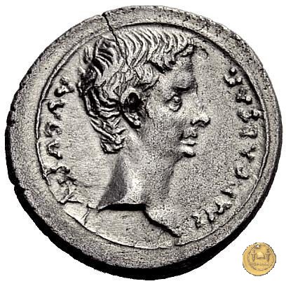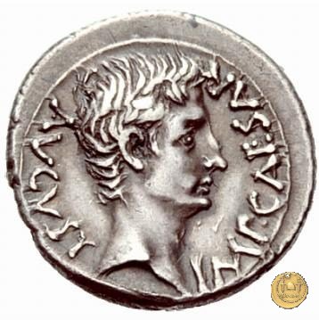 CLM229 Dritto: ![]() CAESAR ![]() AVGVSTVSTesta di Augusto rivolta verso destra. Verso: → SIGNIS - RECEPTIS Marte, elmato e con mantello, in piedi verso sinistra ma con la testa rivolta verso destra; nella mano destra, un'aquila, nella sinistra, uno stendardo poggiato sulla spalla. | |