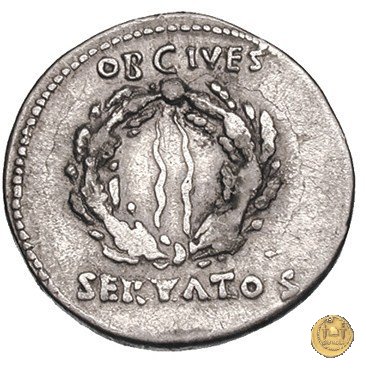CLM219 Dritto: ![]() CAESAR ![]() AVGVSTVSTesta di Augusto rivolta verso sinistra. Verso: → OB CIVES / SERVATOS La legenda, sopra e sotto una ghirlanda di quercia con i lacci rivolti verso l'alto. | |