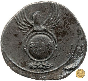 CLM196 Dritto: Testa di Augusto, laureata, rivolta verso destra. Verso: → CAESAR / AVGVSTVS; S - P / Q - R; CL V Uno scudo circolare iscritto, tra due rami di alloro. | |