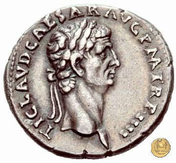 CLM14 Dritto: ↻ TI CLAVD CAESAR AVG P M TR P IIII Busto di Claudio, laureato e rivolto verso destra. Verso: ![]() PRAETOR ![]() RECEPTClaudio, togato e rivolto verso destra, che stringe la mano ad un soldato rivolto verso sinistra, con i capelli lunghi, uno scudo a tracolla e un'aquila sulla spalla. | |