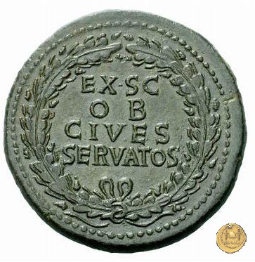 CLM54 Dritto: ↻ TI CLAVD CAESAR AVG GERM P M TR P Busto di Claudio, laureato e rivolto verso destra. Verso: → EX S C / OB CIVES / SERVATOS La legenda, su tre righe, inserita dentro una ghirlanda con foglie di quercia. | |