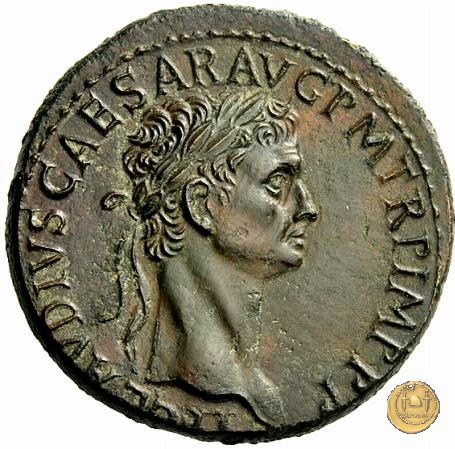 CLM2 Dritto: ↻ TI CLAVD CAESAR AVG P M TR P Busto di Claudio, laureato d'alloro e di quercia, rivolto verso destra. Verso: → DE GERMANIS Arco di trionfo sormontato da una statua equestre rivolta verso sinistra e da due trofei. | |