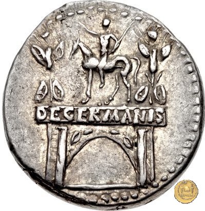 CLM36 Dritto: ↻ NERO CLAVDIVS DRVSVS GERMANICVS IMP Testa di Claudio Druso, laureata con foglie di quercia, rivolta verso sinistra. Verso: → DE / GERM Arco di trionfo sormontato da una statua equestre rivolta verso destra e da due trofei con altrettanti prigionieri legati ad essi; il cavaliere porta con se una lancia. | |