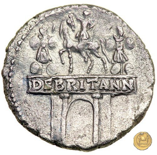 CLM23 Dritto: ↺ TI CLAVD CAESAR AVG P M TR P VIIII IMP XVI Busto di Claudio, laureato e rivolto verso destra. Verso: → DE BRITANN Arco di trionfo sormontato da una statua equestre, con in mano una lancia e rivolta verso sinistra, e da due trofei. | |