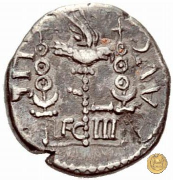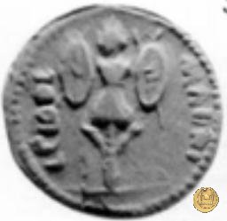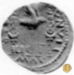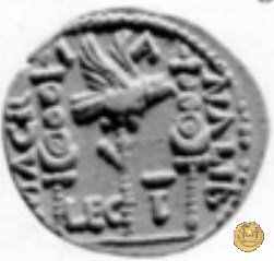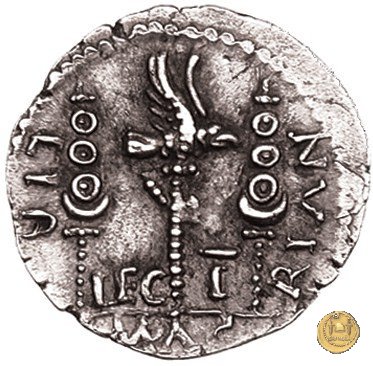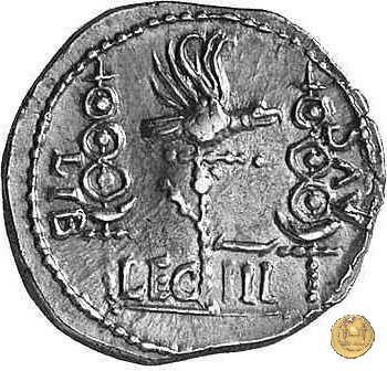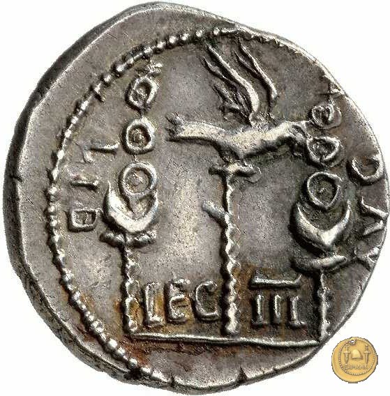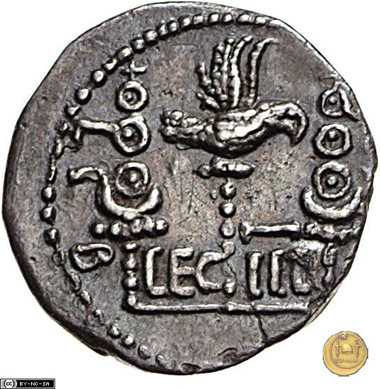 CLM15 Dritto: ![]() L - CLODI MACRI; → S CBusto di una Vittoria rivolto verso destra, drappeggiato e con le ali spiegate verso l'alto. Verso: ![]() LI - B ![]() AVG; → LEG - III Uno stendardo con in cima un'aquila che vola verso destra in mezzo ad altri due. | |