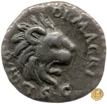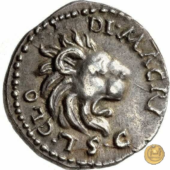 CLM14 Dritto: ↻ L CL - O - DI MACRI; → S C Testa di leone rivolta verso destra. Verso: → MACR (esergo) ↑ IANA ↓ LIB; → LEG - I Uno stendardo con in cima un'aquila che vola verso destra in mezzo ad altri due. | |