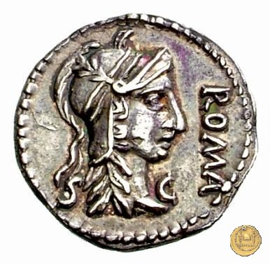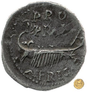 CLM52 Dritto: ↻ L CLODIVS MACER; → C - S Testa di Clodio Macro rivolta verso destra. Verso: → PROPRA - E (sopra) ![]() AFRICAE (sotto)Una galea andante verso destra, con 12 remi e 5 rematori. | |