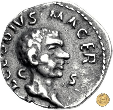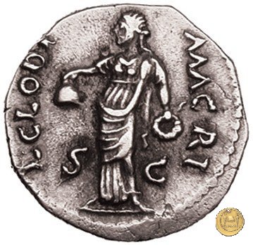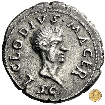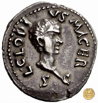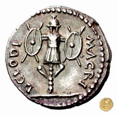 CLM23 Dritto: ↑ L CLODI, ↓ MACRI; → S - C La Libertas in piedi verso sinistra, drappeggiata, con in mano un pileo e una patera. Verso: → MAC (esergo) ↑ RIANA ↓ LI - B; → LEG - I Uno stendardo con in cima un'aquila che vola verso destra in mezzo ad altri due. | |