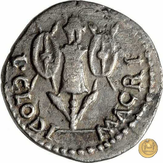 CLM7 Dritto: ![]() L CLODI MACRI ![]() LIBERATRIX; → S CBusto dell'Africa rivolto verso destra, drappeggiato e con elmetto ad elefante. Verso: ↺ MAC - R - IA - NA LI - B; → LEG - I Uno stendardo con in cima un'aquila che vola verso destra in mezzo ad altri due. | |