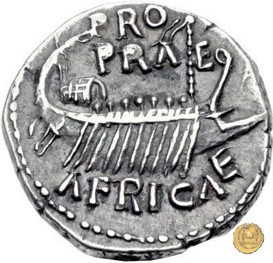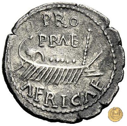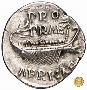 CLM53 Dritto: ↻ L CLODIVS MACER; → S C Testa di Clodio Macro rivolta verso destra. Verso: → PRO / PRAE (sopra) ![]() AFRICAE (sotto)Una galea andante verso destra, con 12 remi e 7 (8?) rematori. | |