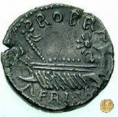 CLM49 Dritto: ![]() L CLODIVS ![]() MACER; → S CTesta di Clodio Macro rivolta verso destra. Verso: → PRO / PRAE (sopra) ![]() AFRICAE (sotto)Una galea andante verso destra, con 10 remi e 6 rematori. | |