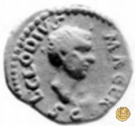 CLM20 Dritto: ↻ L CLODI MACRI; → S-C Busto di una Vittoria rivolto verso destra con le ali rimpiegate. Verso: → LI - B ↑ AVG; → LEG - III Uno stendardo con in cima un'aquila che vola verso destra in mezzo ad altri due. L'asta dello stendardo di mezzo si allunga sino all'esergo. | |