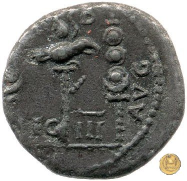 CLM32 Dritto: ↻ L CLODI MACRI CARTHAGO; → S C Busto della Tyche di Cartagine, turrito e drappeggiato, rivolto verso destra; dietro una cornucopia. Verso: ↻ ![]() I - C - I - L - I - APiccola faccia di Medusa su trikelis che corre in senso antiorario; fra le gambe, delle spighe di grano. | |