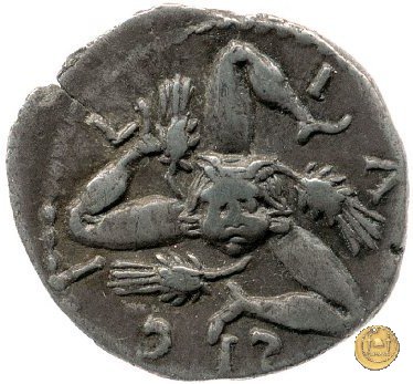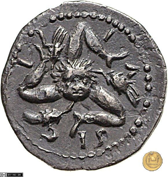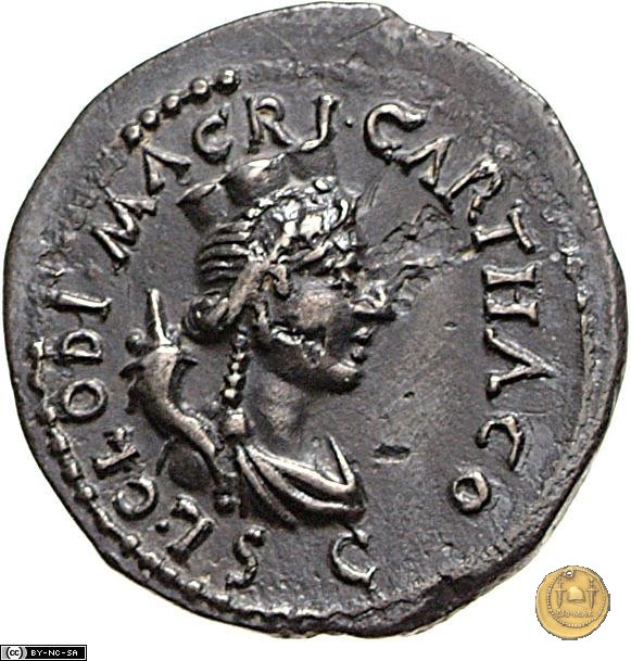 CLM29 Dritto: ![]() L CLODI MACRI ![]() CARTHAGO; → S CBusto della Tyche di Cartagine, turrito e drappeggiato, rivolto verso destra; dietro una cornucopia. Verso: ![]() SI - C - I - LI - APiccola faccia di Medusa su trikelis che corre in senso antiorario; fra le gambe, delle spighe di grano. | |
