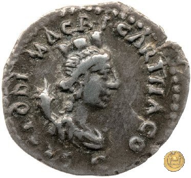 CLM6 Dritto: ![]() L CLODI MACRI ![]() LIBERATRIX; → S CBusto dell'Africa rivolto verso destra, drappeggiato e con elmetto ad elefante. Verso: ↑ MACR → I - A ↓ NA LIB; → LEG - I Uno stendardo con in cima un'aquila che vola verso destra in mezzo ad altri due. | |