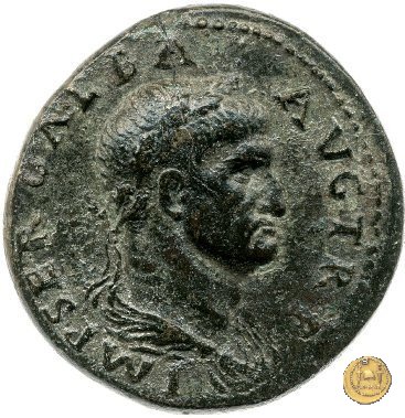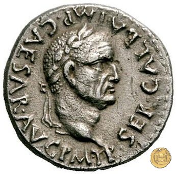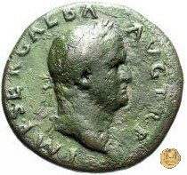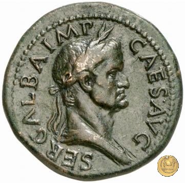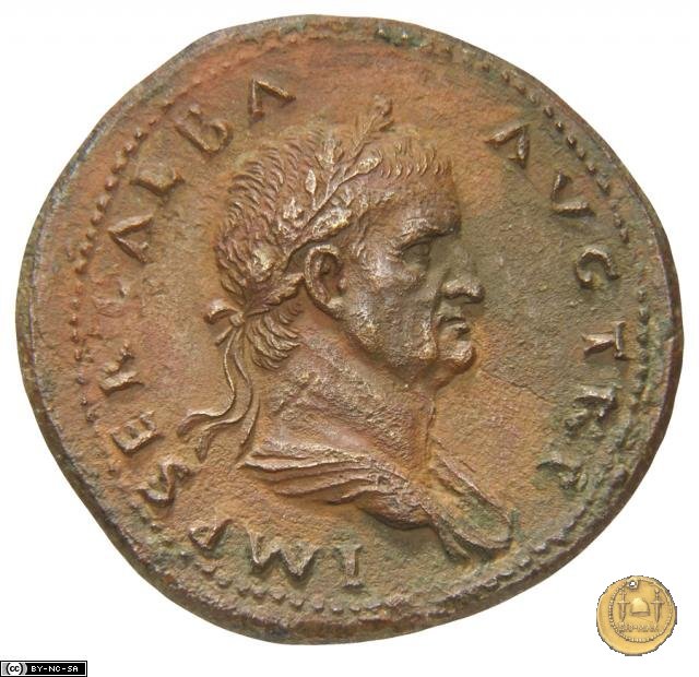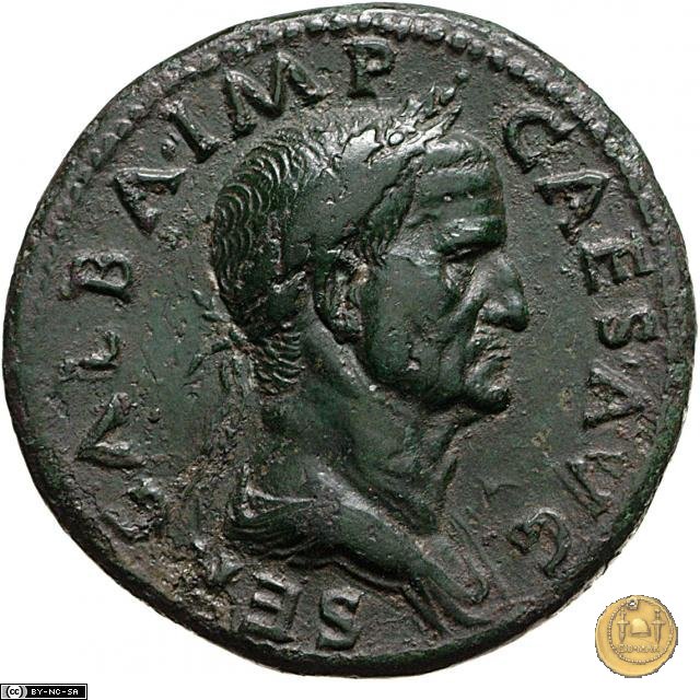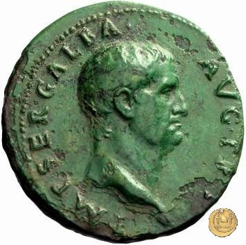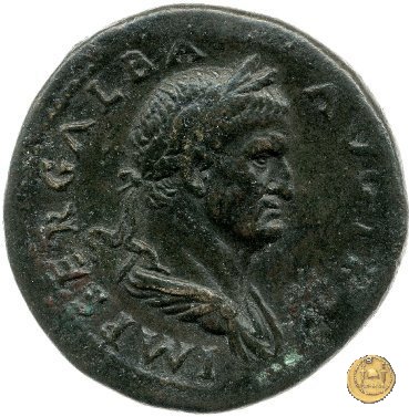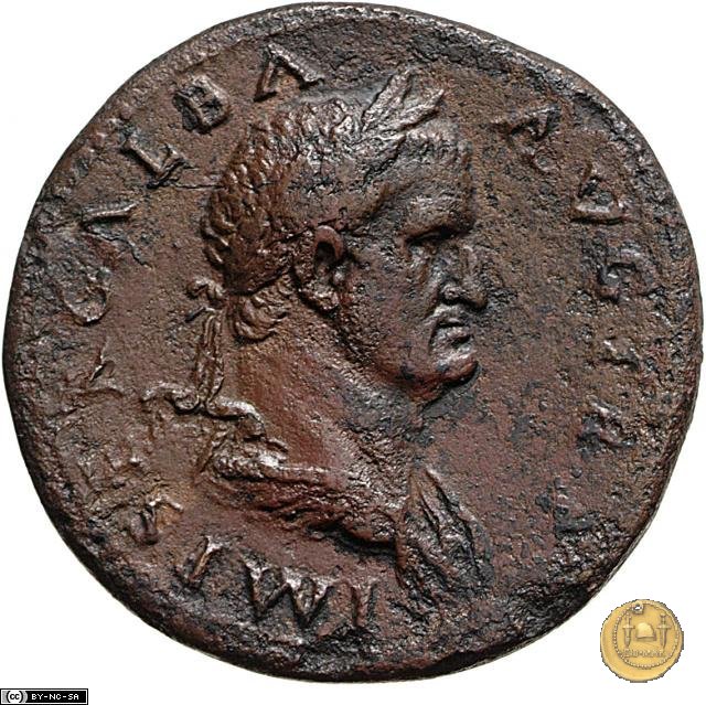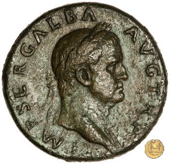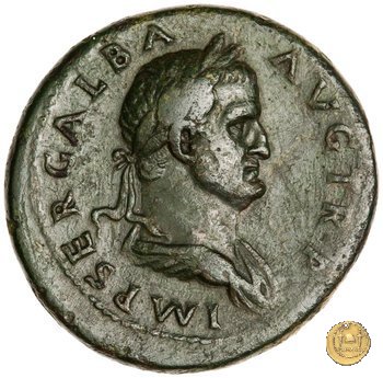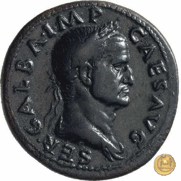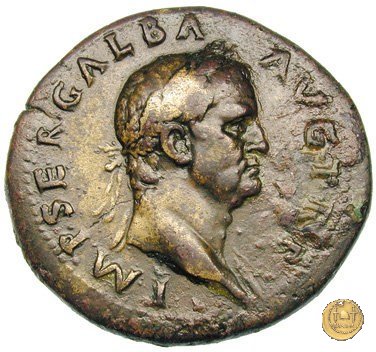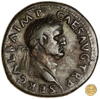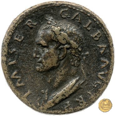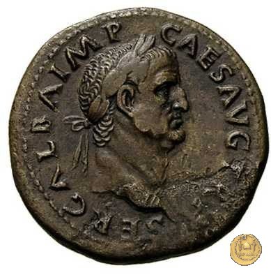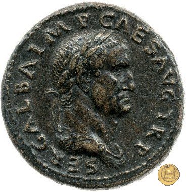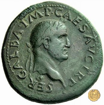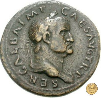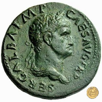 CLM575 Dritto: ↻ SER SVLPIVS GALBA IMP AVG; → S C Testa di Galba rivolta verso destra. Verso: ![]() HISPANIA; → S - CIl busto dell'Hispania, laureato, drappeggiato e rivolto verso destra, con i capelli legati dietro il collo. Dietro, due giavellotti; sotto, uno scudo circolare; di fronte, due spighe di grano. | |