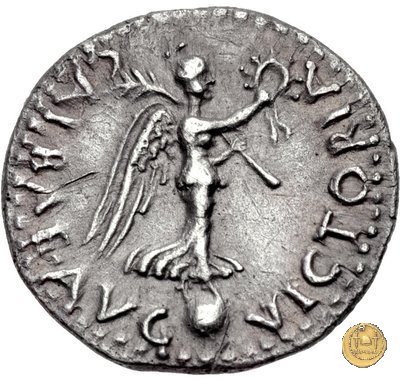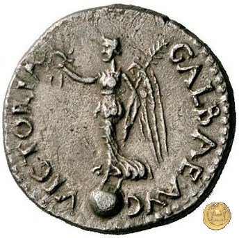 CLM234 Dritto: ↺ SER GALBA IMP CAESAR AVG P M T P Testa di Galba, laureata, rivolta verso destra. Verso: ![]() VICTORIA ![]() GALBAE AVGUna Vittoria, drappeggiata, in piedi verso destra su di un globo; nella mano destra una ghirlanda, nella sinistra una palma. | |