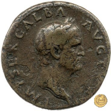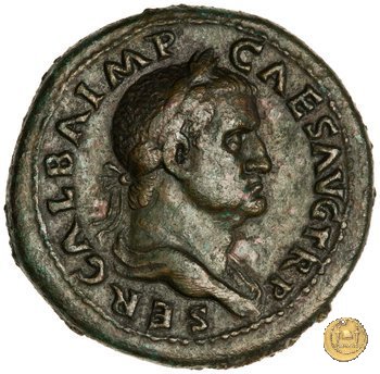 CLM583 Dritto: ↻ SER SVLPICIVS GALBA IMP AVG; → S C Testa di Galba rivolta verso destra. Verso: ↓ VIRTVS La Virtus, drappeggiata e in piedi rivolta verso sinistra. Nella mano destra una Vittoria con in mano una ghirlanda; nella sinistra, uno scettro. | |