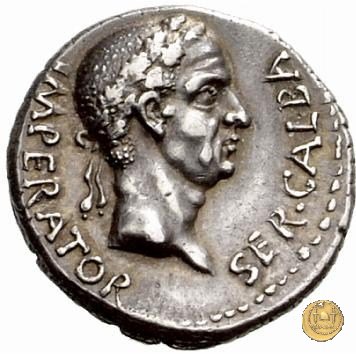 CLM171 Dritto: ↻ IMP SER GALBA AVG Testa di Galba, laureata, rivolta verso destra. Verso: → IMP (esergo) La Gallia, in abbigliamento militare, che cavalca verso destra con il braccio destro steso. |