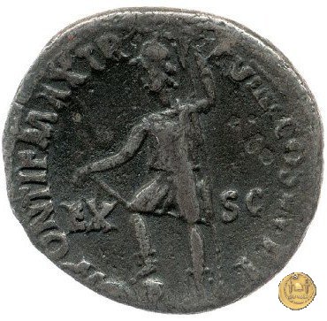 CLM49 Obverse: ↺ NERO CAESAR AVG IMP Testa di Nerone rivolta verso destra. Reverse: ![]() PONTIF MAX TR ![]() P VIII COS IIII P P; → EX - S CLa Virtus, elmata e in abbigliamento militare rivolta verso sinistra; il piede destro su di un pila di armi; tiene con la mano destra il parazonium sul ginocchio e con la sinistra una lancia. | |