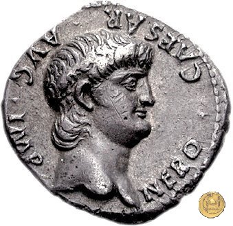 CLM83 Obverse: ↻ NERO CLAVD CAESAR AVG GER P M TR P IMP P P Busto di Nerone, laureato e con l'egida, rivolto verso destra. Reverse: → DECVRSIO (esergo) Nerone che galoppa verso destra, corazzato e con il mantello che sventola. Davanti a lui un soldato a piedi che procede verso destra e con la testa rivolta indietro, con in mano un vessillo. Dietro di lui, un altro soldato, elmato, che corre verso destra. | |