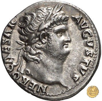 CLM53 Obverse: ↺ NERO CAESAR AVG IMP Testa di Nerone rivolta verso destra. Reverse: ![]() PONTIF MAX TR ![]() P X COS IIII P P; → EX - S CLa Virtus, elmata e in abbigliamento militare rivolta verso sinistra; il piede destro su di un pila di armi; tiene con la mano destra il parazonium sul ginocchio e con la sinistra una lancia. | |