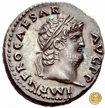 CLM73 Obverse: ↻ NERO CLAVDIVS CAESAR AVG GERM P M TR P IMP P P Busto di Nerone, laureato e con l'egida, rivolto verso destra. Reverse: → ADLOCVT COH (esergo) Nerone, togato e rivolto verso sinistra, con un prefetto del pretorio, anch'esso togato, su di una piattaforma sulla destra; la mano destra è rivolta a 3 soldati, in piedi verso destra, disposti su una fila e dei quali i primi due, tengono due stendardi. Nello sfondo, una struttura a semiluna. | |