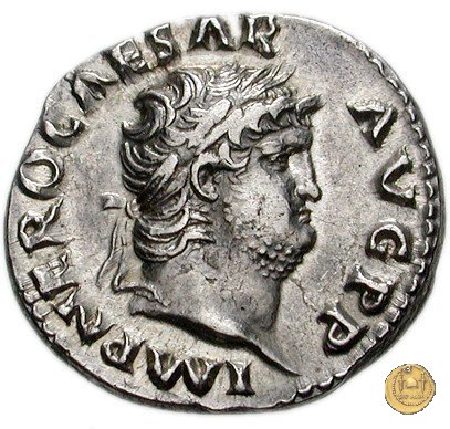 CLM21 Obverse: ↺ NERO CAESAR AVG IMP Testa di Nerone rivolta verso destra. Reverse: ![]() PONTIF MAX TR ![]() P X COS IIII P P; → EX - S CLa Virtus, elmata e in abbigliamento militare rivolta verso sinistra; il piede destro su di un pila di armi; tiene con la mano destra il parazonium sul ginocchio e con la sinistra una lancia. | |