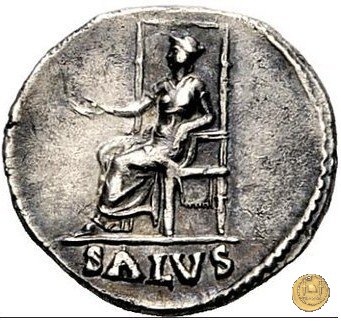 CLM29 Obverse: ![]() NERO CAESAR ![]() AVGVSTVSTesta di Nerone con barba e laureata, rivolta verso destra. Reverse: → SALVS (esergo) La Salus, drappeggiata e rivolta verso sinistra, seduta su di un trono, con in mano una patera. | |